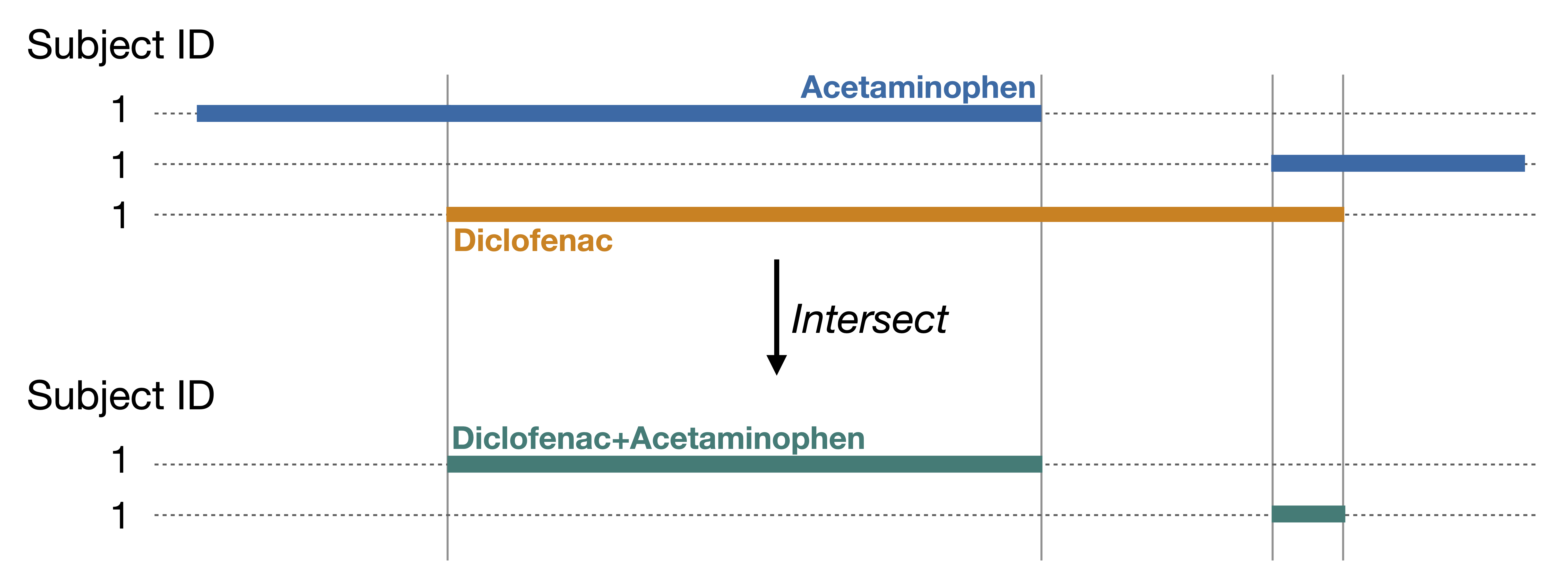 Create a new cohort that contains people who had an exposure to both diclofenac and acetaminophen at the same time using.